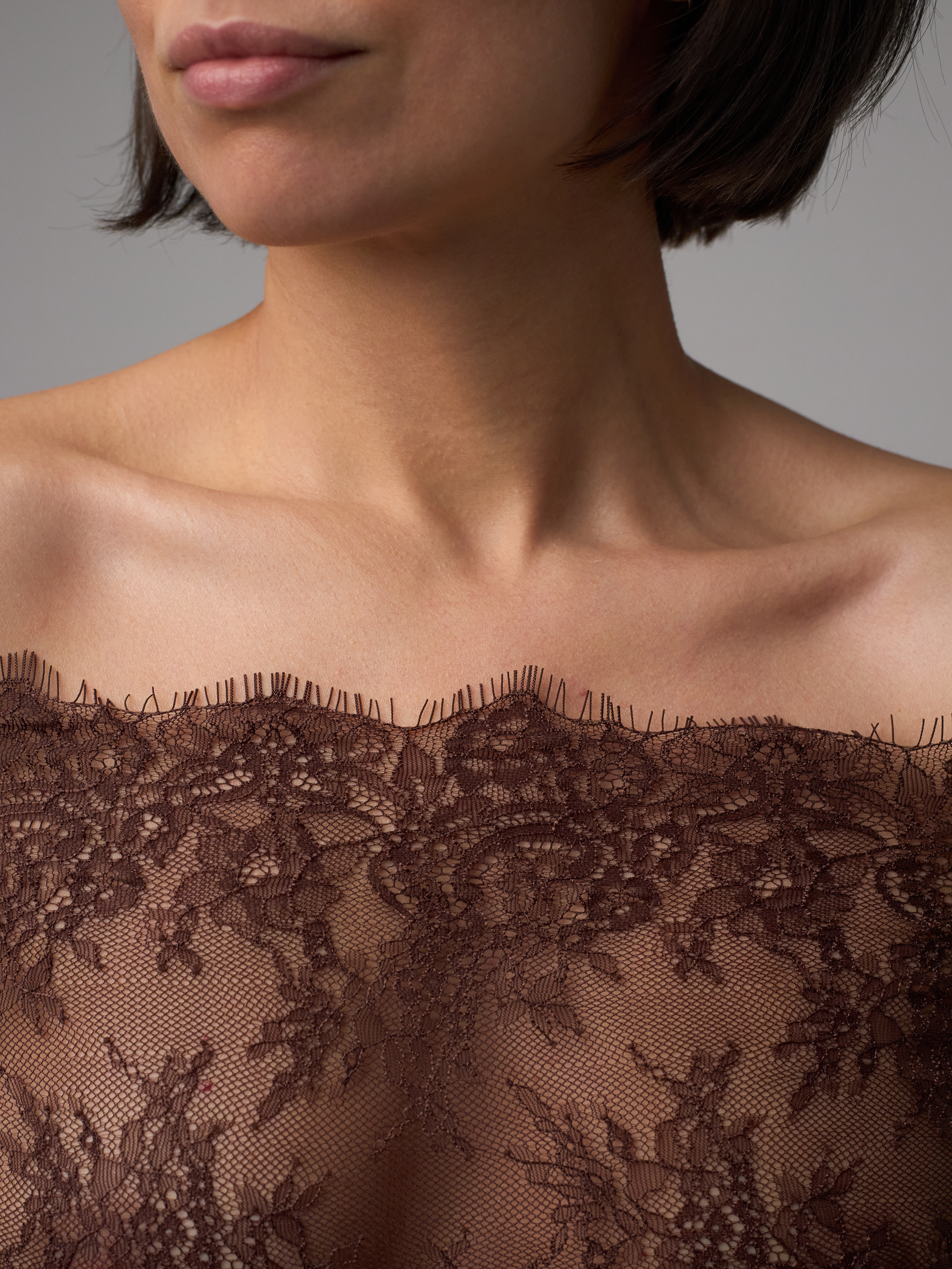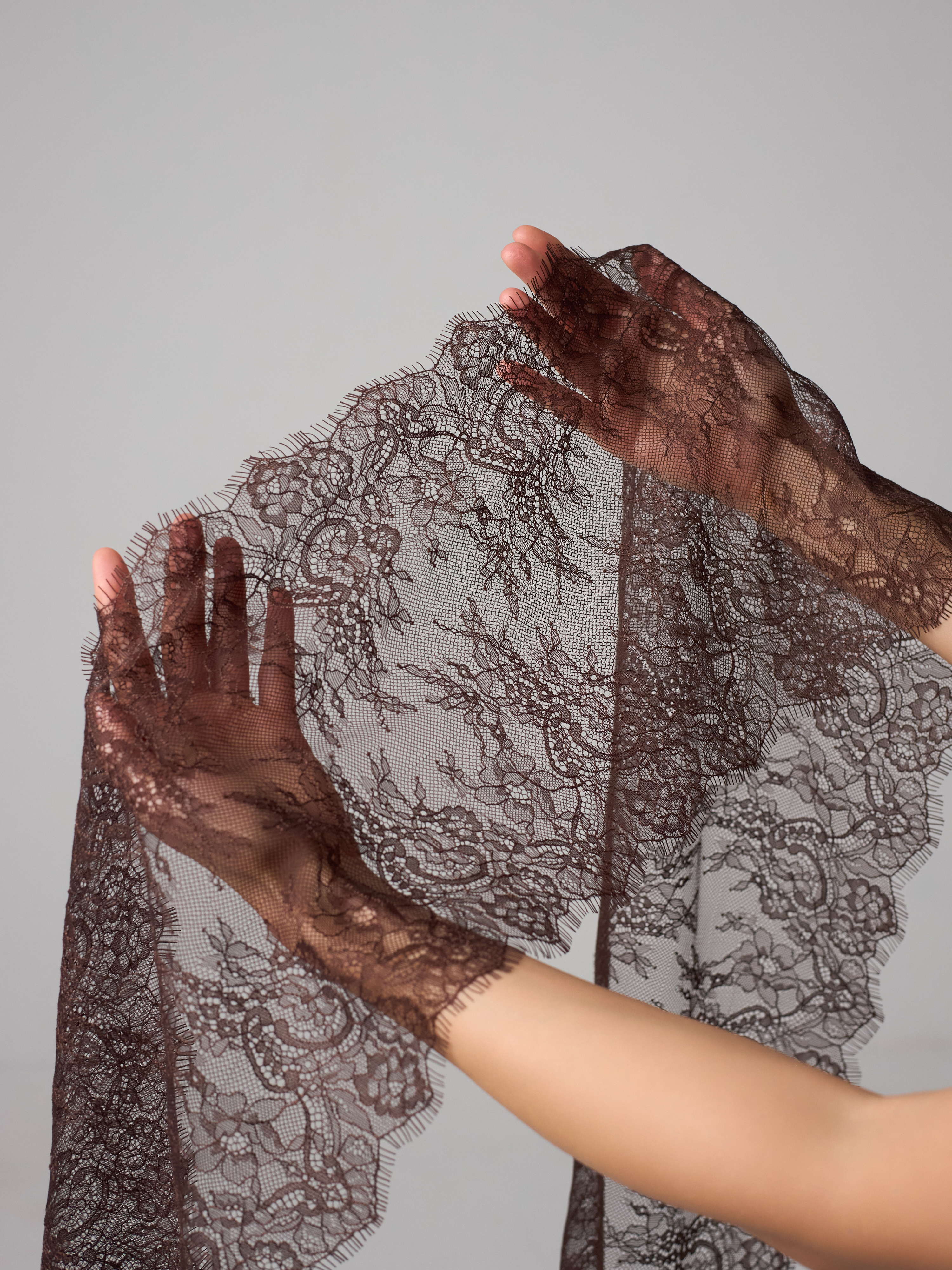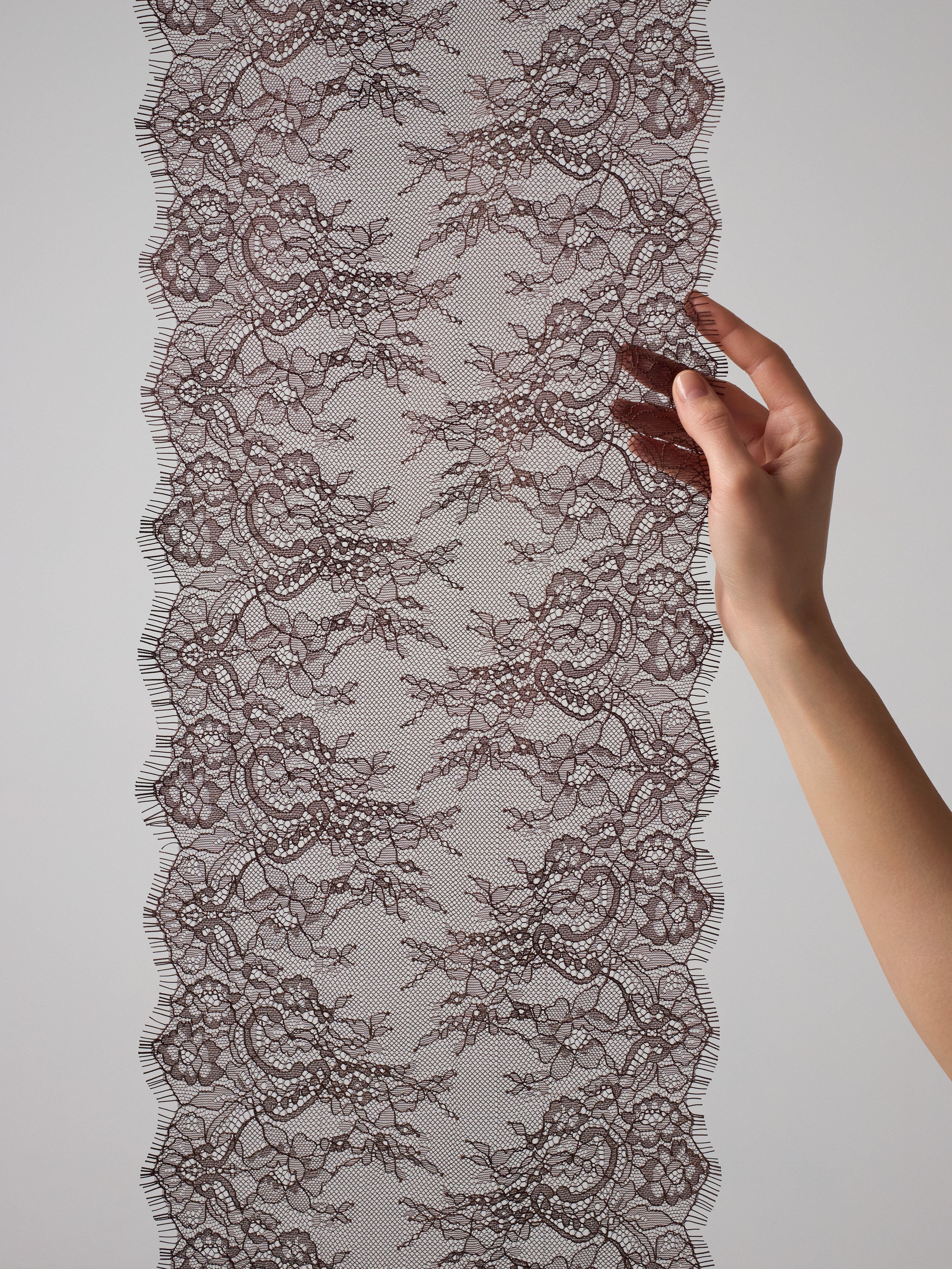 Кружево реснички шантильи неэластичное (в его составе нет эластана, но оно немного тянется за счет плетения) с красивым узором из цветочков и витиеватых линий, острыми фестонами и чудесными ресничками. Нежное и приятное на ощупь.