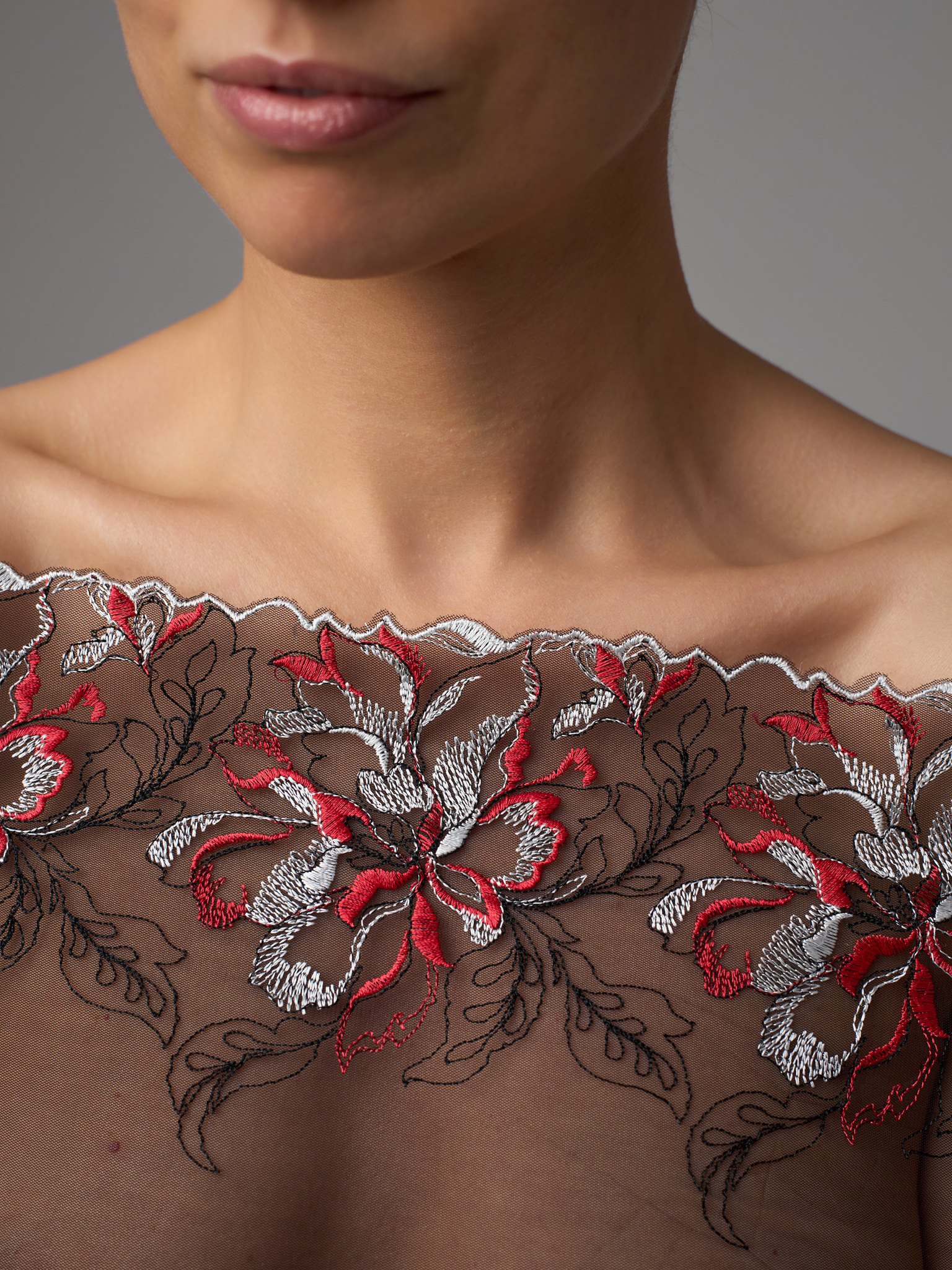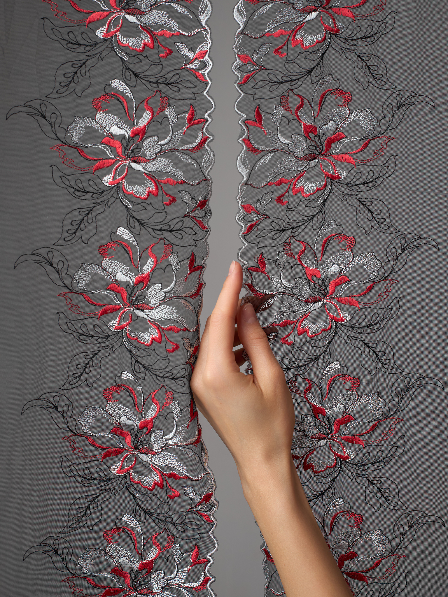 Вышивка на сетке - ткань для рукоделия. Черная сетка с красным и серым узором - невесомая, воздушная и очень нежная.