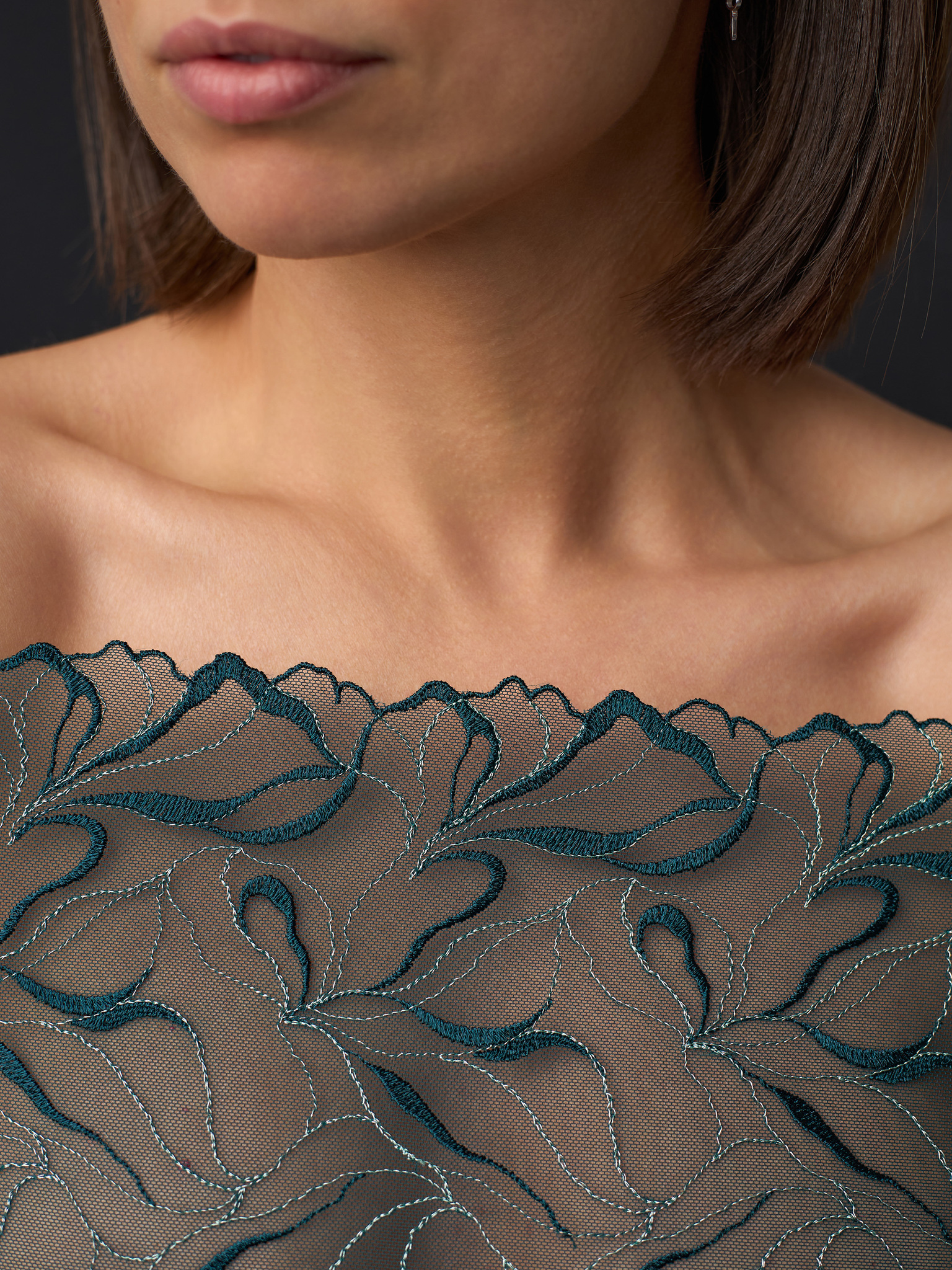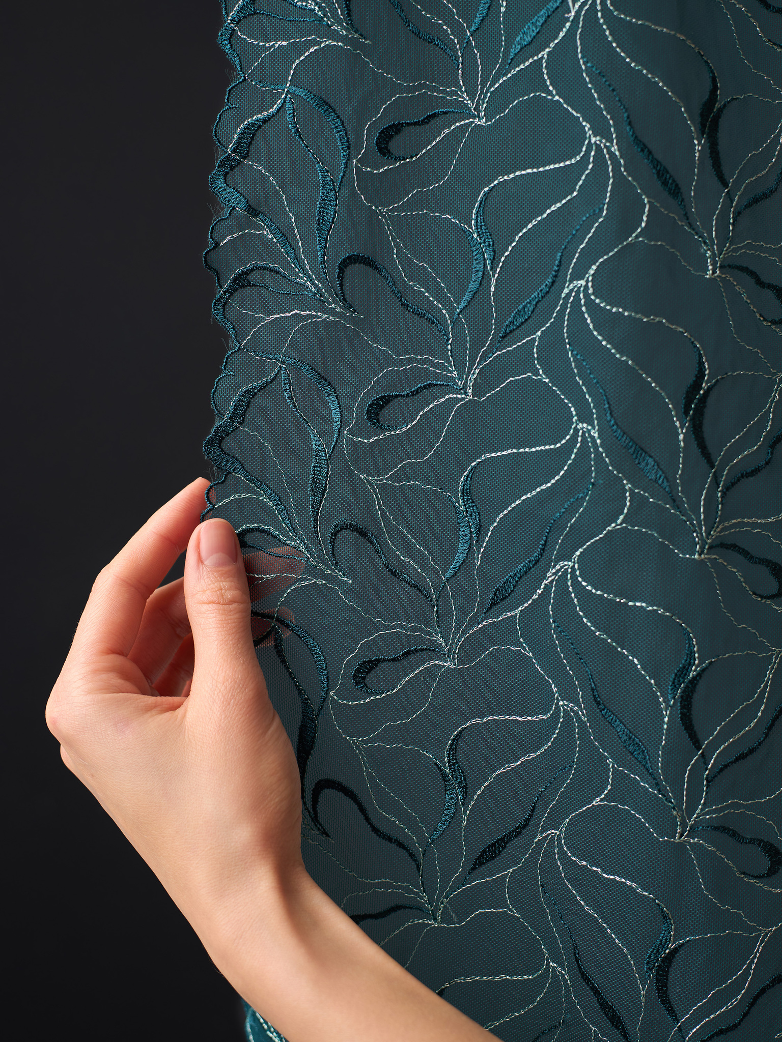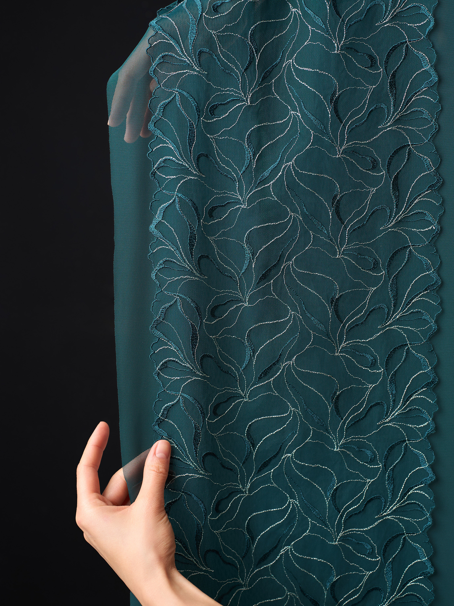 Вышивка на сетке не содержит эластан, т.е. неэластичная. Но при этом она совсем немного тянется из-за особенности плетения. В основе - специальная ткань сетка, похожая на гипюр. Прозрачная, но достаточно прочная. Кружевное полотно приятно тактильно. Его срез не осыпается. Кружево имеет одно направление рисунка, оно одностороннее.