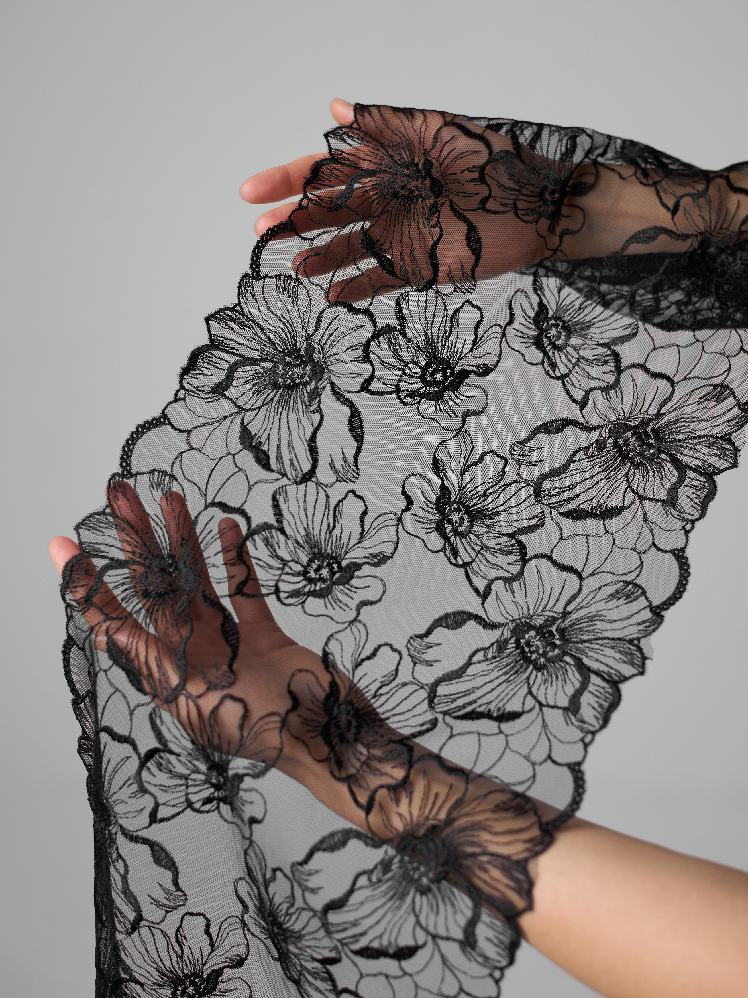 Вышивка на сетке не содержит эластан, т.е. неэластичная. Но при этом она совсем немного тянется из-за особенности плетения. В основе - специальная ткань сетка, похожая на гипюр. Прозрачная, но достаточно прочная. Кружевное полотно приятно тактильно. Его срез не осыпается. Кружево имеет одно направление рисунка, оно одностороннее.