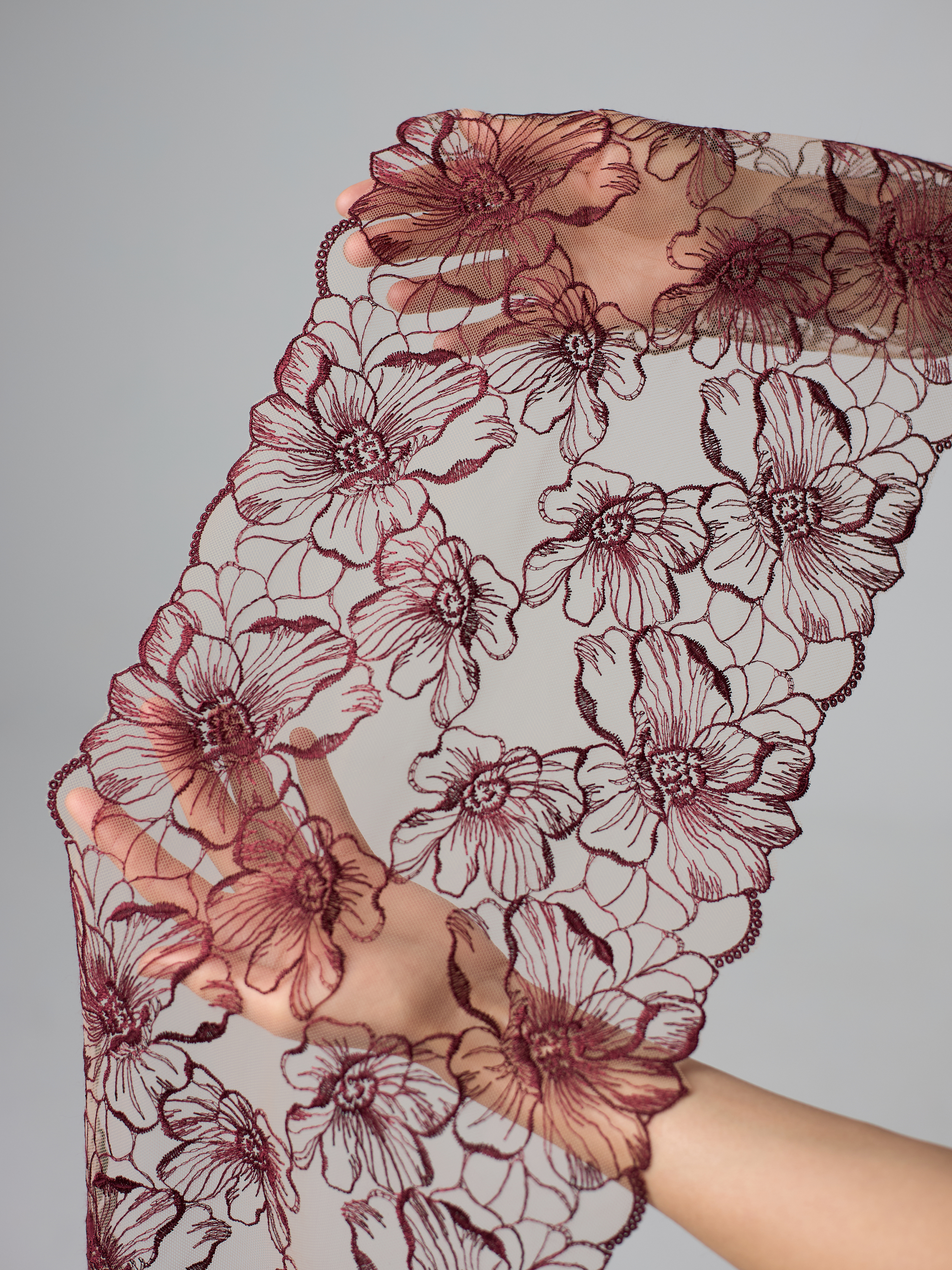 Вышивка на сетке - ткань для рукоделия. Бежевая сетка с бордовым цветочным узором. Контрастная, воздушная и такая красивая на теле.
