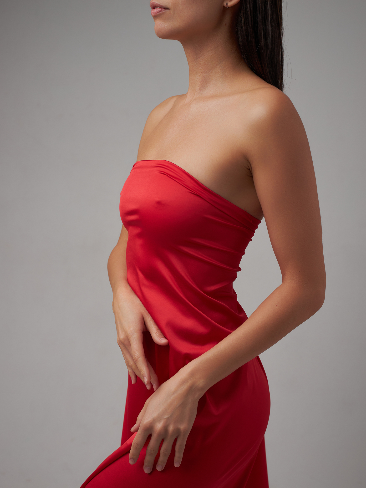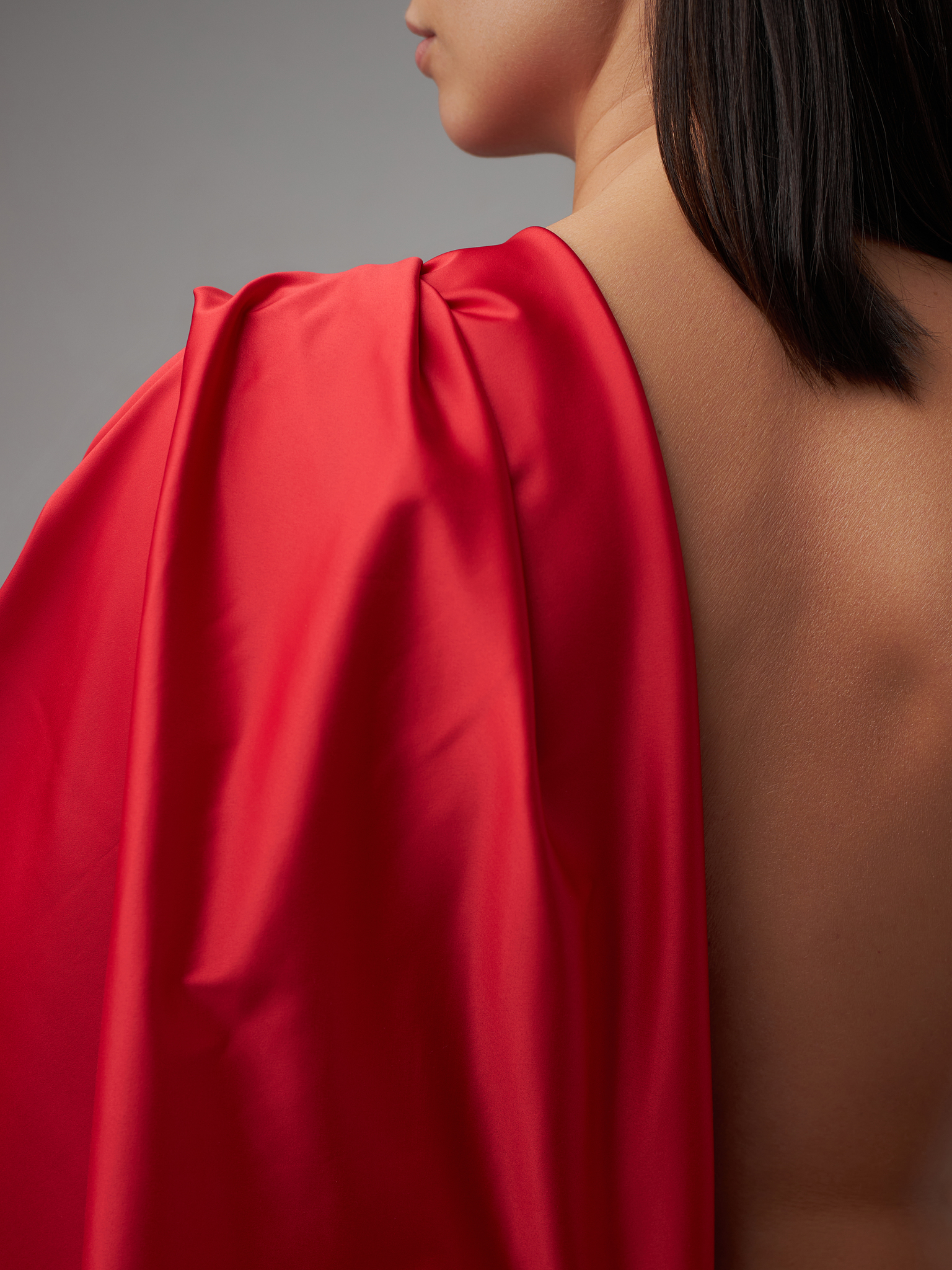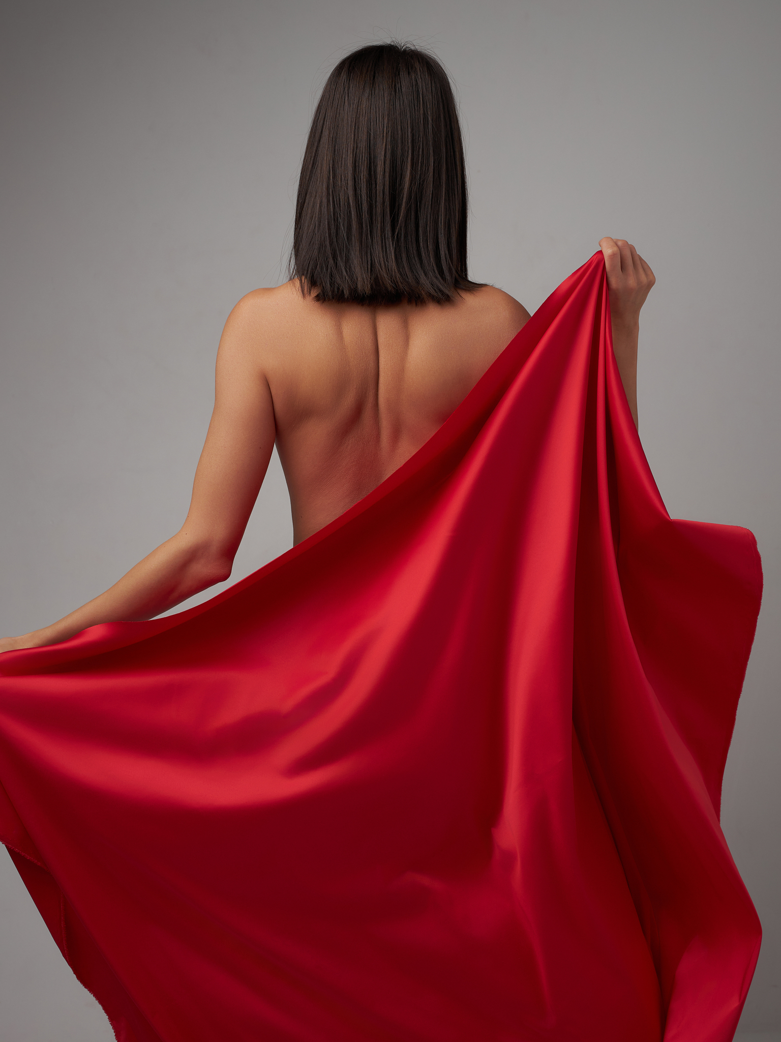 Атлас-стрейч - гладкая шелковистая эластичная ткань однотонного красного цвета с завораживающим матовым переливом. Его не зря называют искусственным шелком. Атлас высшего качества производят из шелковой нити, но, чтобы сделать эту ткань доступнее для многих покупателей, его варианты удешевляют за счет добавления синтетических волокон (например, полиэстера). Так и получают стрейч-атлас.
