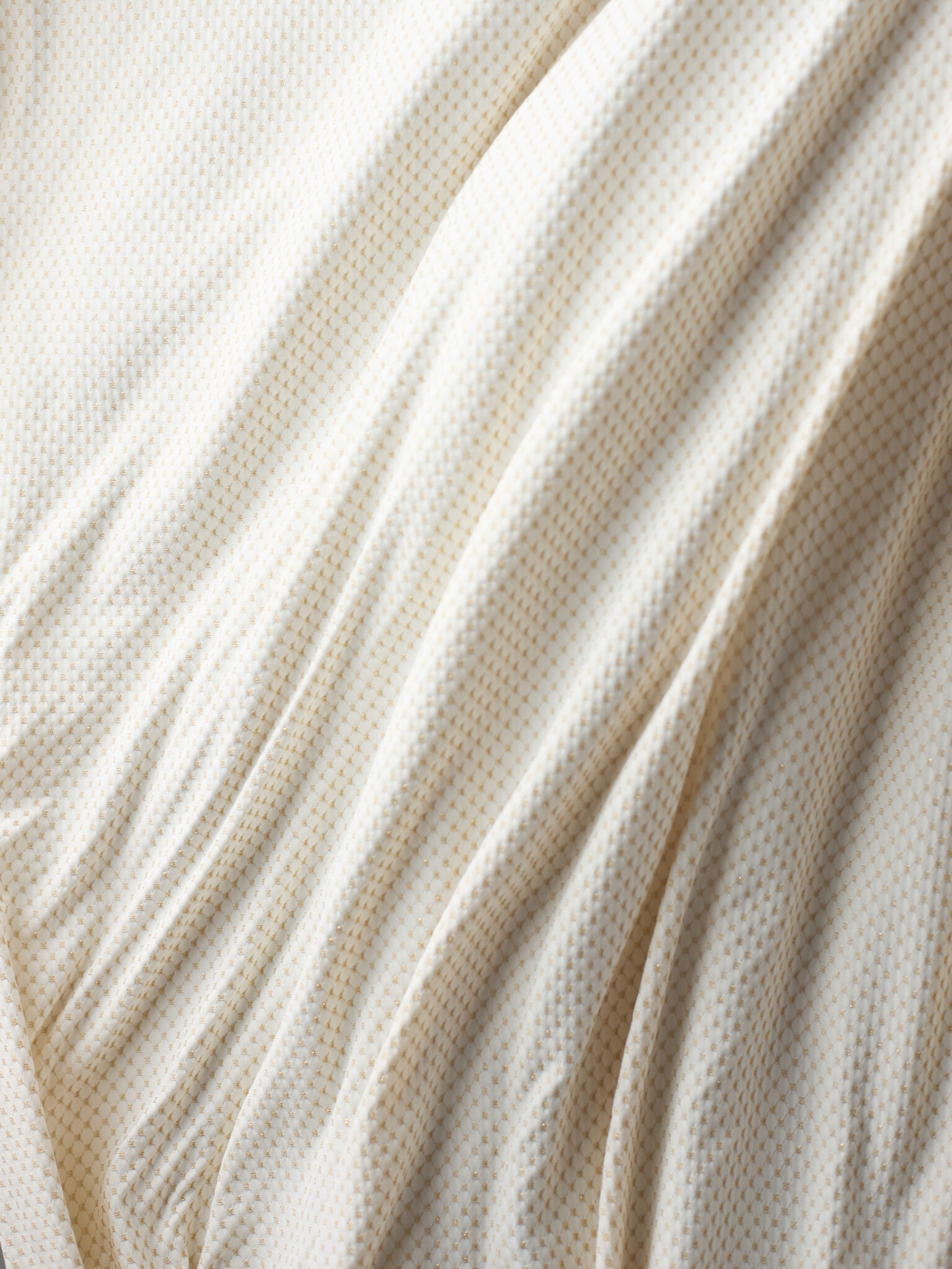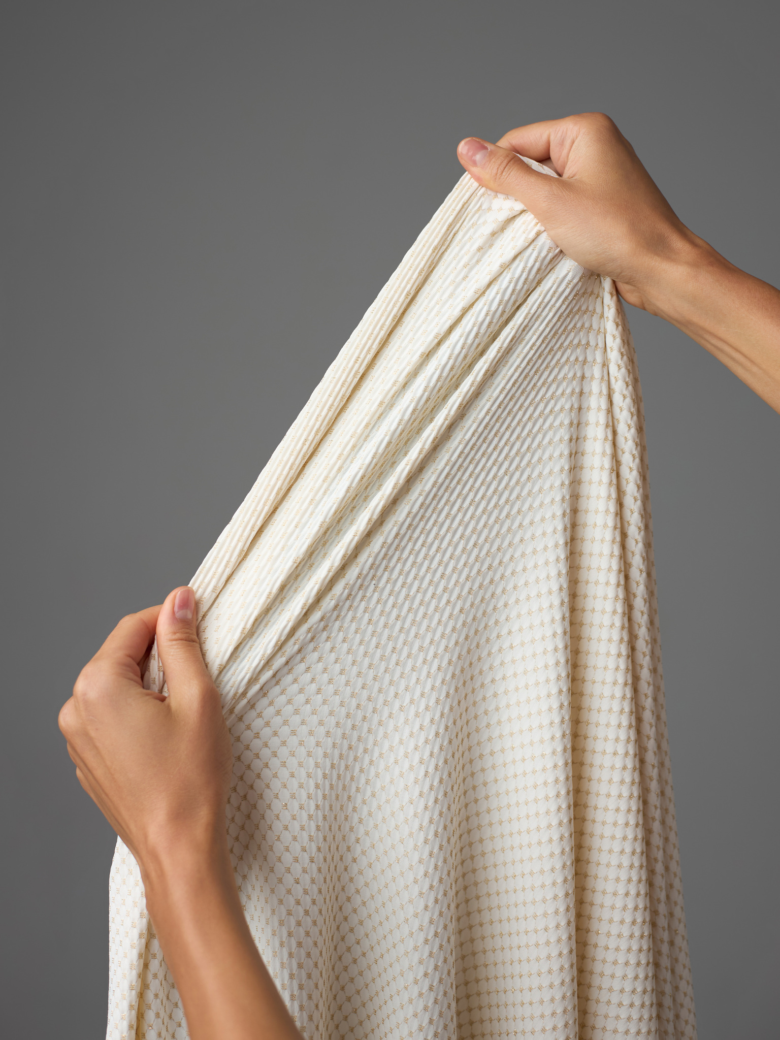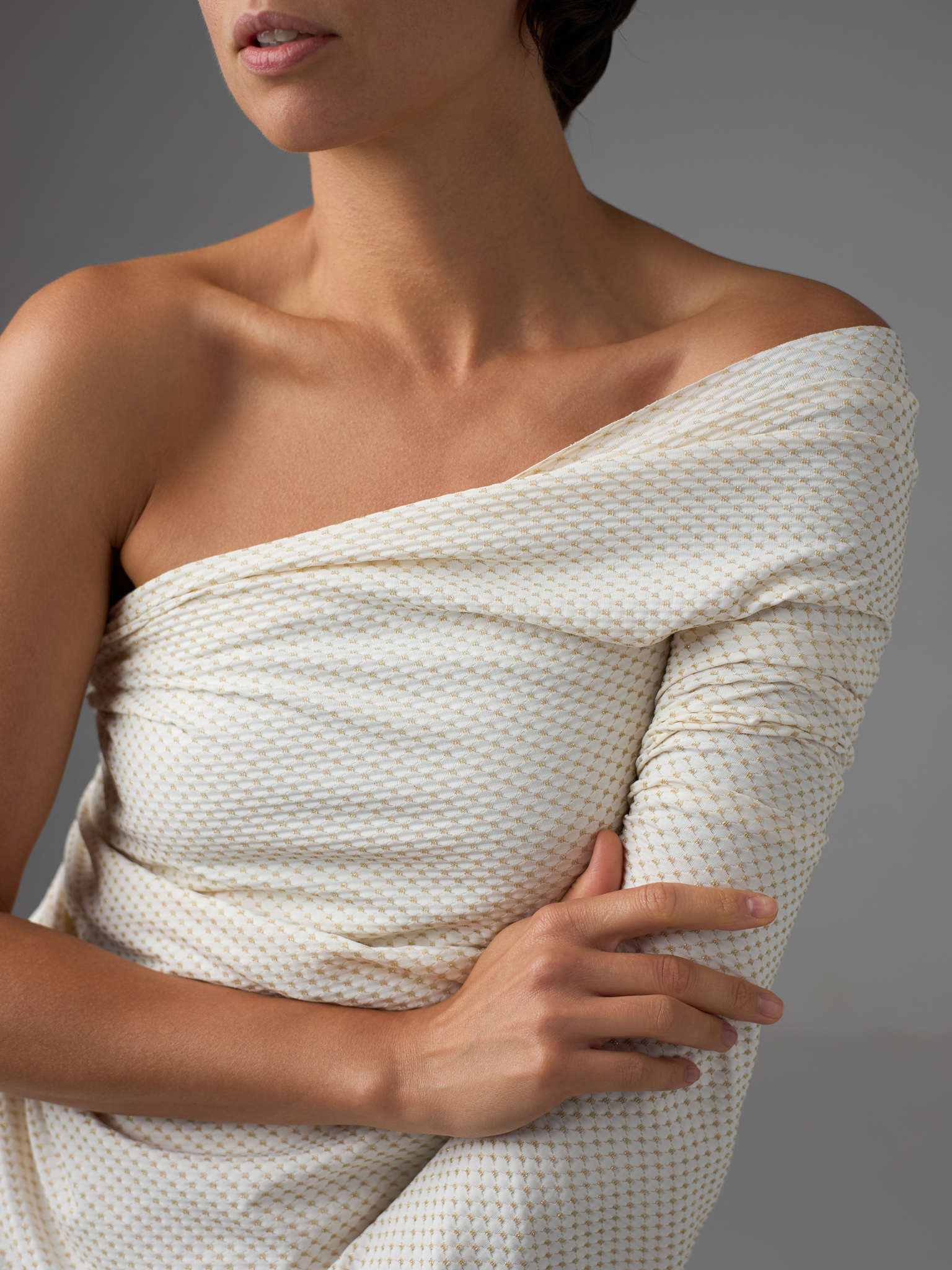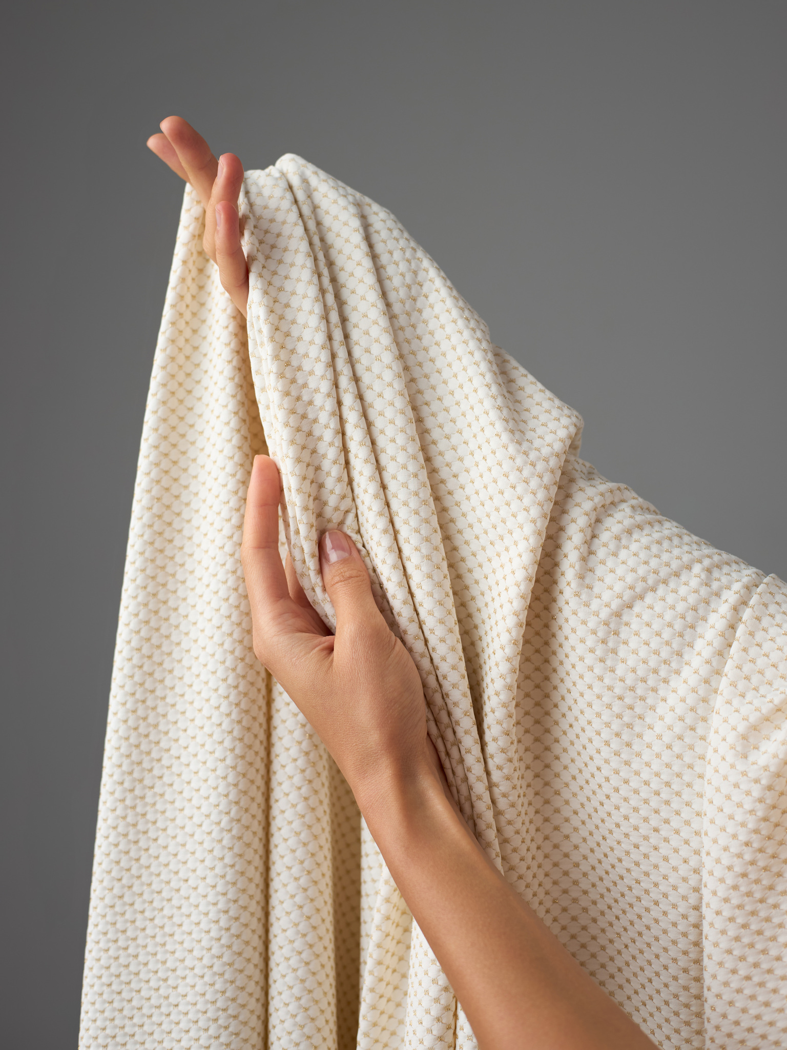Это бархатистая, рельефная ткань цвета айвори с геометрическим принтом. Лицевая сторона вывязана золотым люрексом, но на изнанке люрекса нет, поэтому она приятна к телу.